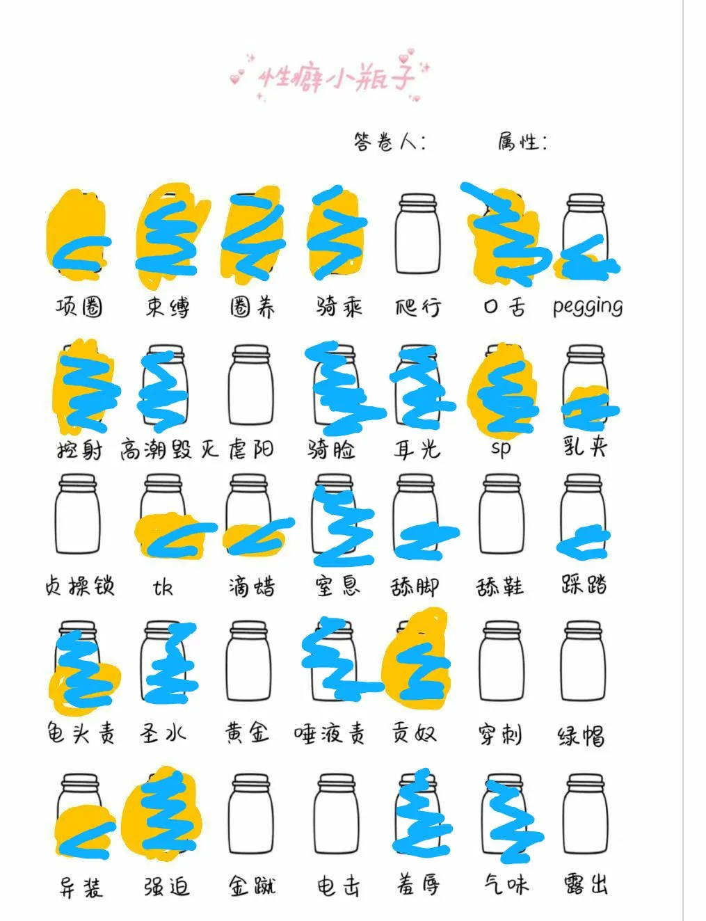 和yue老师的xp意外的契合呢,白色是没兴趣但可以接受,红叉是无法接受,金就和高潮毁灭不清楚是什么意思