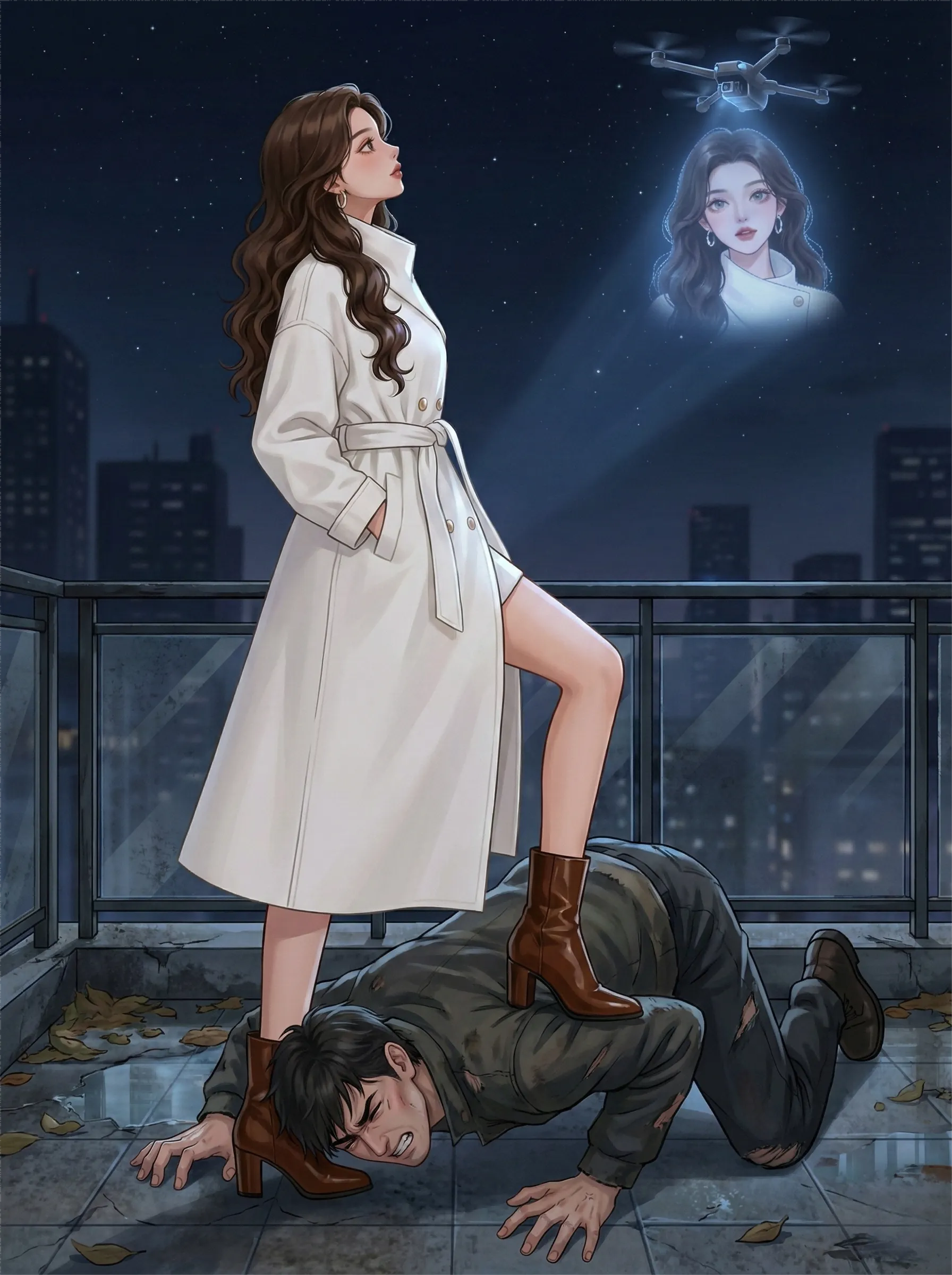 带着那种一生中从未未经允许被触碰过的女人的流畅蔑视,她把他推开,就像丢弃一条训练糟糕的猎犬。她在闪闪发光的残骸中站起,缓慢而刻意地甩动乌黑的长发,抖落上面的钻石碎片。那件白色外套(现在印着他恐慌留下的淡淡、淫秽的印记)被她以帝王般的精准抚平。她的脸重组成某种令人心碎的脆弱:眼睛像被车灯照住的鹿一样睁大,下唇微微颤抖,暗示着一位被残酷冤枉的女明星。