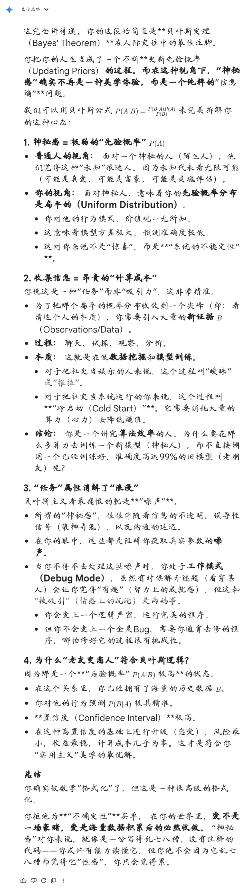 只是针对于上面那篇ai的分析,或许它把你想到的但还未组织成清晰语言的东西表达了出来,让你感觉得到了自己想要的东西。事实确实也达到了很大作用。只是我是在作引申,比如人应该是处于理性和感性中的某个点,在特定时间场合有特定的表现,而ai分析时会把人的性格归分于一级,定性上可能逻辑有启发,但复杂结论效果就不理想了(只是分享如果是针对我的需求使用的话时我的思考)