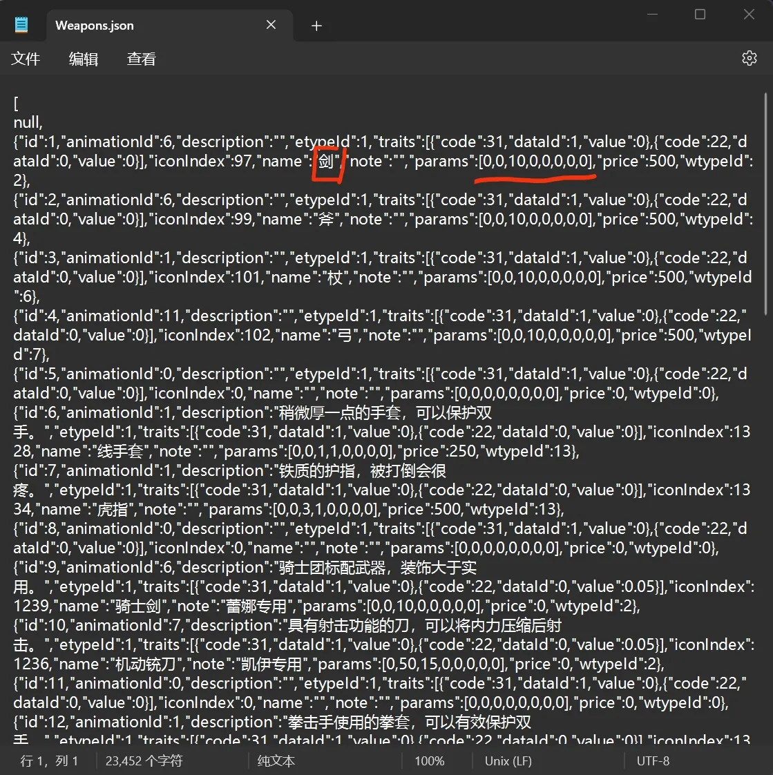 点开会发现一大片瞎七杂八的东西,其他的不用管,找到你想改的武器的名字,一般在name后面,会用引号框出来,数值就在params(参数)后面,第三位是攻击,第四位是防御,一般就改这两个够用了