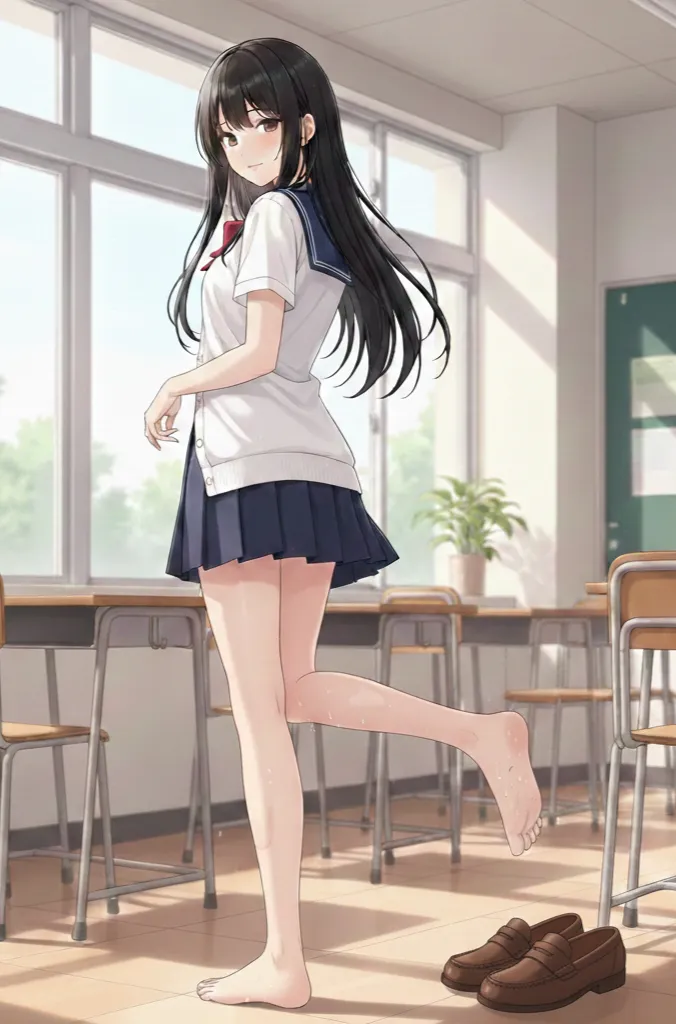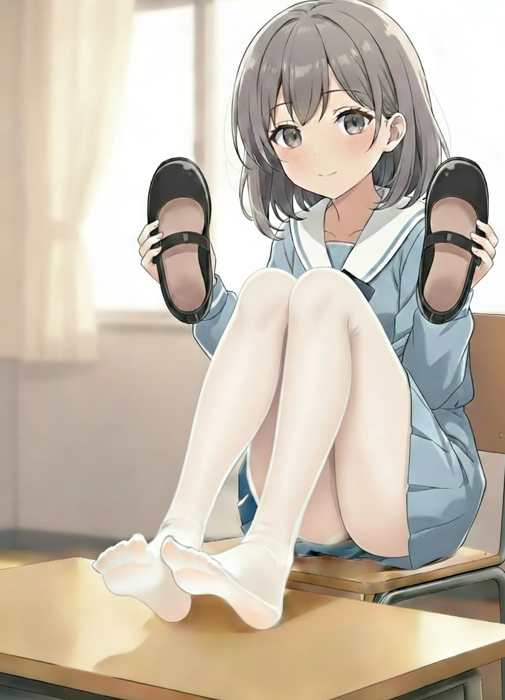 随着鞋子的脱落,那双包裹在白色短袜里的可爱脚掌暴露在空气中 。林华的视线像是不受控制一般向下偏移——他能清晰地看到,在那层薄薄的棉袜足尖处,洇透着淡黑色的汗渍。那是剧烈运动后汗浸湿的痕迹,隐隐散发着一种温热鲜活的少女气息 。