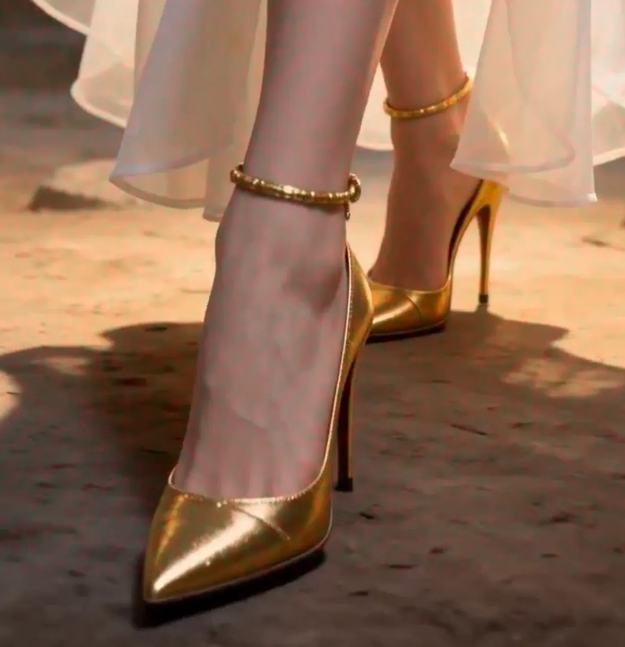 他又寻来黄金胸罩与黄金内裤,那胸罩如金叶般华丽,杯沿镶嵌宝石,裹上玉乳时,紧致却不压抑,乳肉在金光中莹莹生辉;内裤薄如蝉翼,金丝绣莲,贴合阴阜,阴唇的轮廓隐现。他再穿上黄金高跟鞋,那鞋跟纤细如竹,高达数寸,足踝顿时绷紧。起步时,脚掌前倾,疼痛如针刺般从足底升起,每一步都摇曳生姿,却需小心平衡:“高跟鞋的痛楚,竟是这般折磨,却让玉腿更显修长,步态如莲。”他缓缓行走,玉臀轻扭,玉乳在胸罩中微颤,内心体会:观音每日以此姿态示人,原来需承受这隐忍的优雅。观音的灵魂几近崩溃:他穿着我的华服,高跟鞋的咔嗒声中,我的身体成了他的舞步,这羞耻,让我魂魄颤栗。