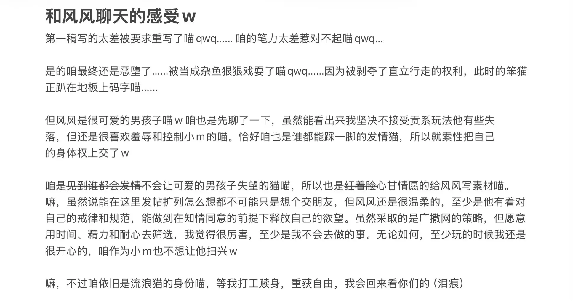 或许是什么压力,又是什么心理他表现的猫习性已然变成了扭曲,但还好,他会制约自己。我要做的事情只有像对待流浪猫一样对待他。