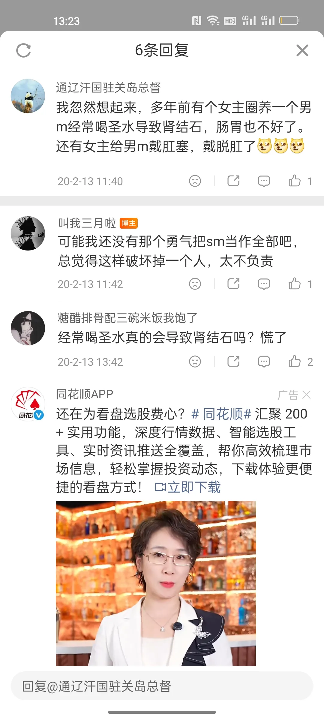 jogger98:↑那就祝你找个富婆吧oso:↑并不太想做,我也知道这样不好。四爱男可以,这起码健康点。不过我生活中也有正常圈子,可以找经济实力不错的女人,bdsm➕四爱不过是我对强大女人的幻想罢了jogger98:↑那就祝你做男s成功vcrunite:↑你一边把女S骂成【自我意识过剩、利用缺爱男、捞资源、玩弄人】,一边公开承认自己最想要的恰恰是【女强男弱(laspaceti当你妻)、吃软饭、物化女M、狠抽完再突然抛弃、绿别人】,不觉得很抽象吗?你觉得那些女s对男m做的下列事例: